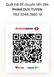 - Số Tài khoản: 11520348396019 – Phạm Duy Tuyển, Ngân hàng Kỹ thương Việt Nam (Techcombank)